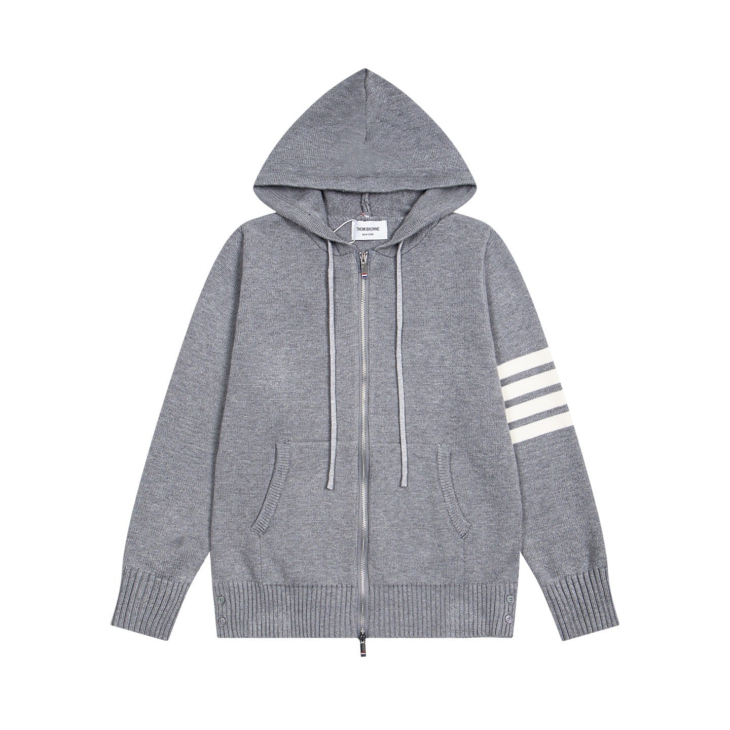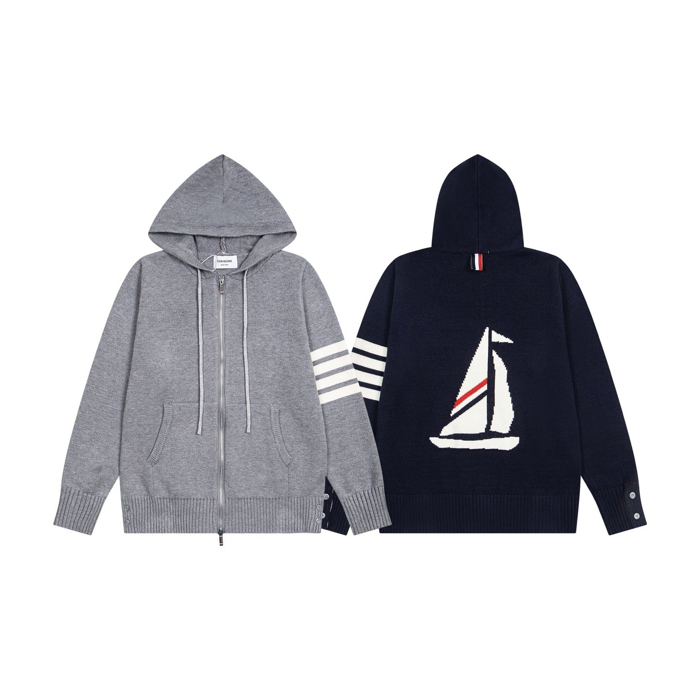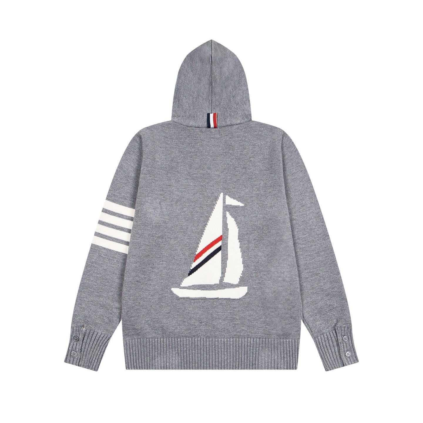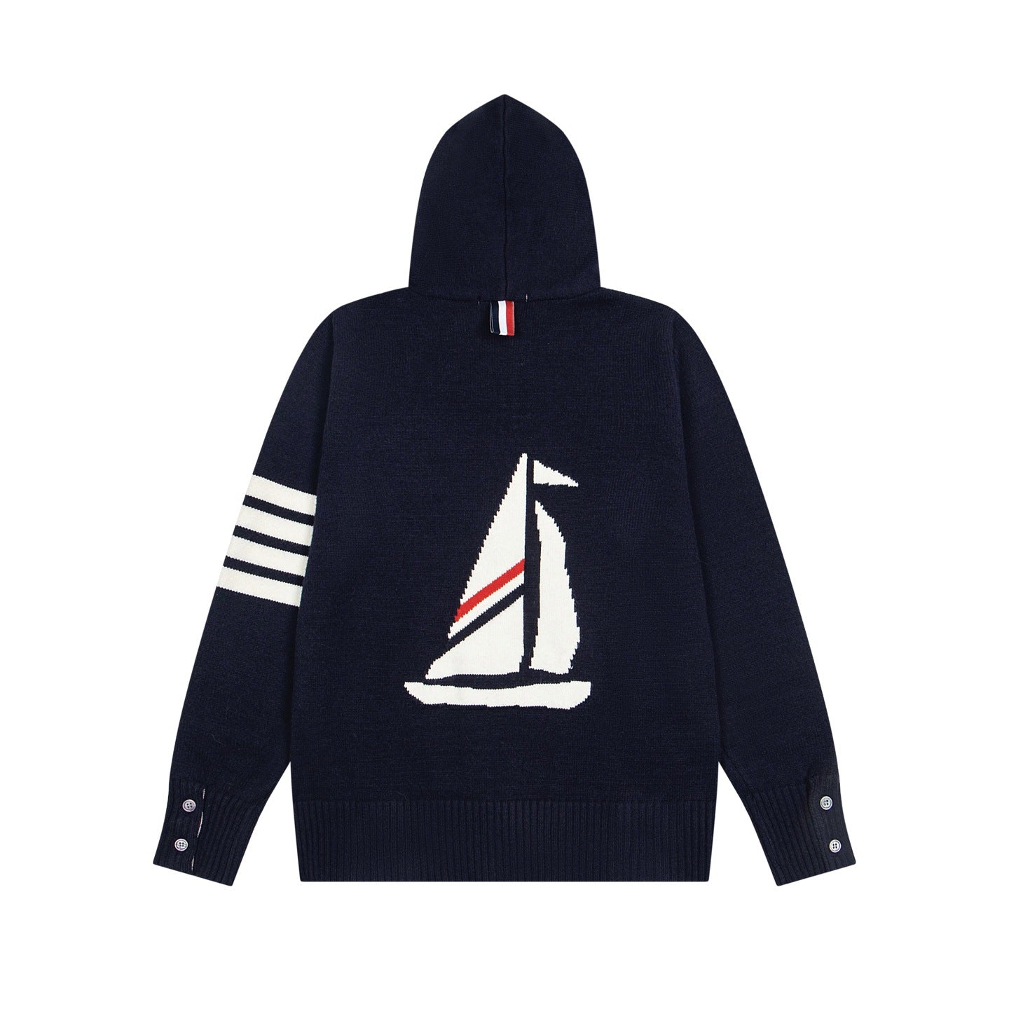 Tom Browne TB Sailboat Hooded Cardigan Color Block Zipper Knitted Sweater Jacket