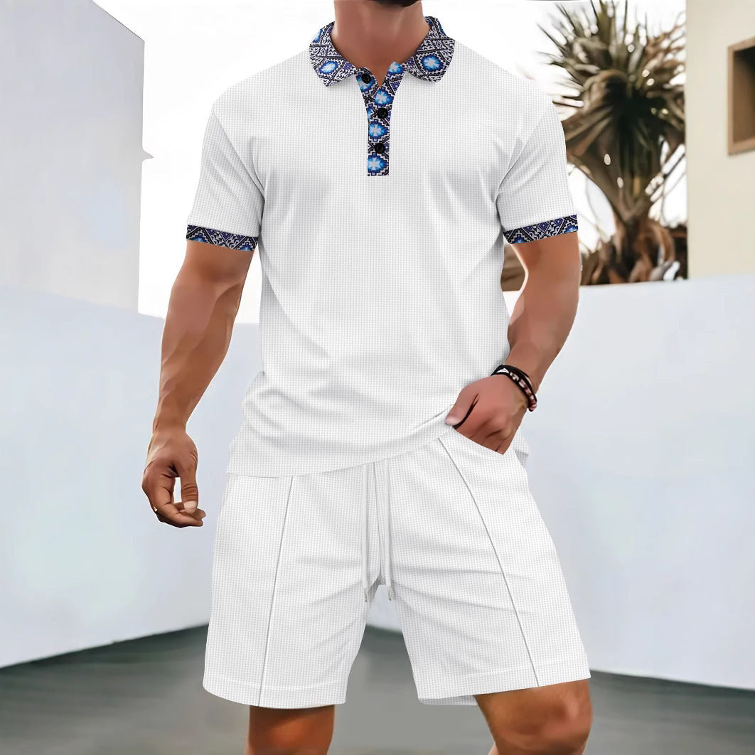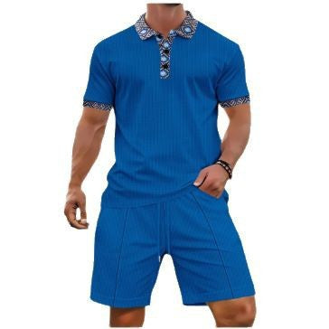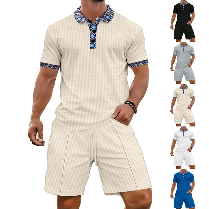 Men's New Waffle Zipper Solid Color Turn-Down Collar Short Sleeve T-Shirt Shorts Casual Set